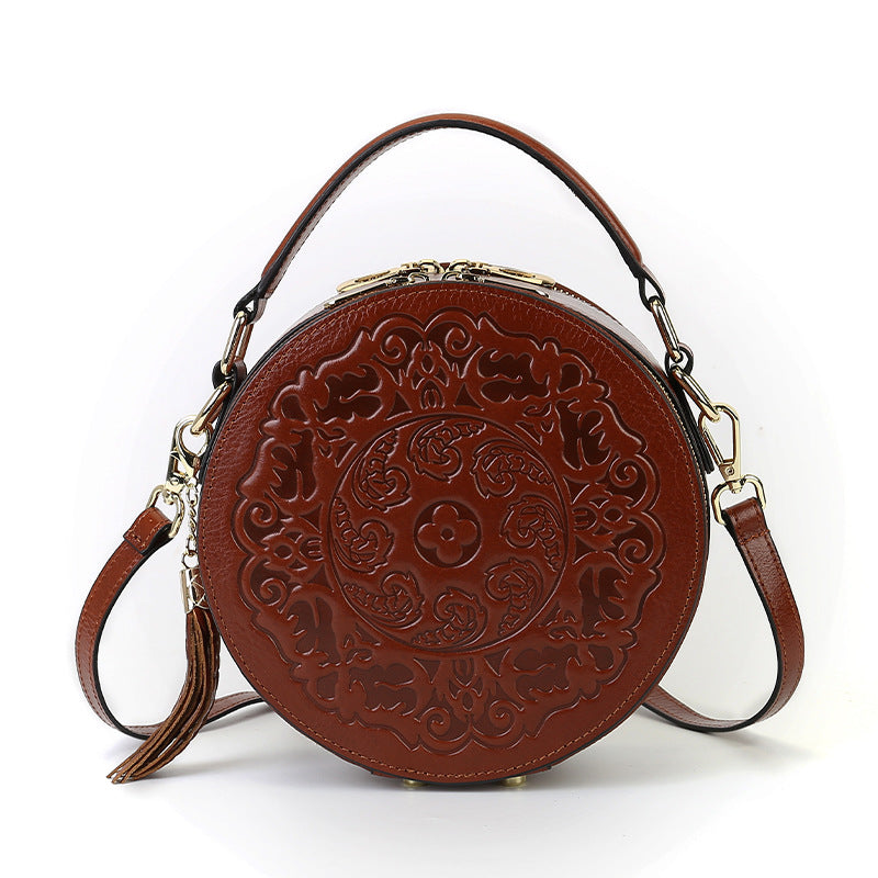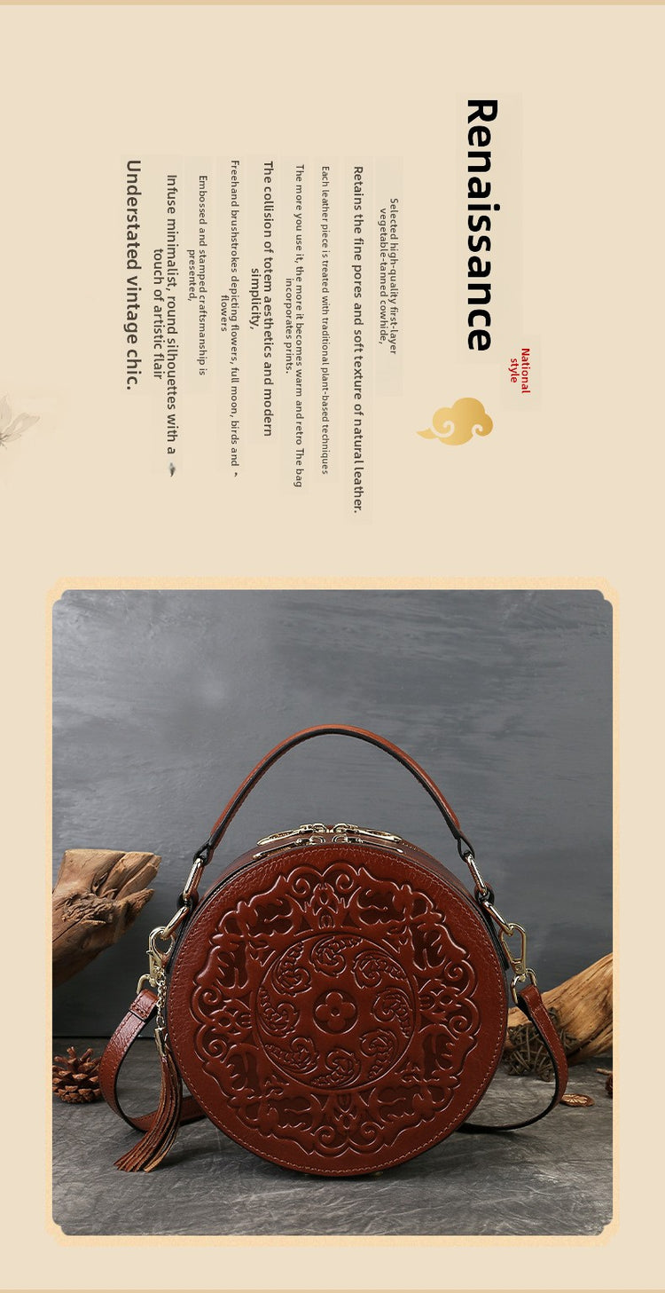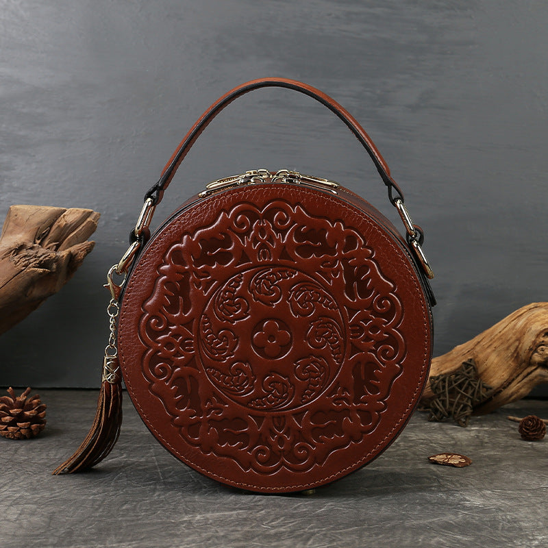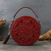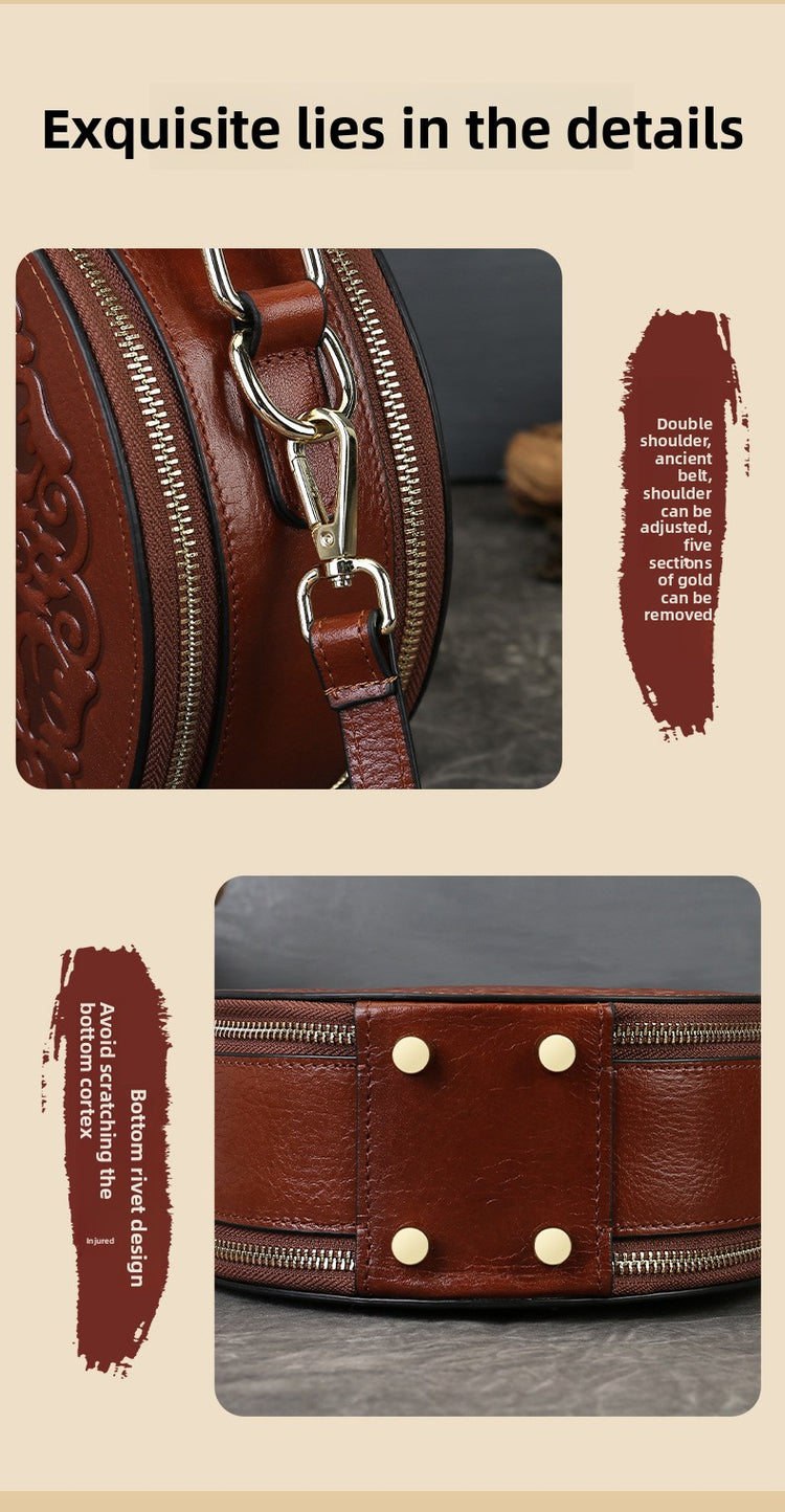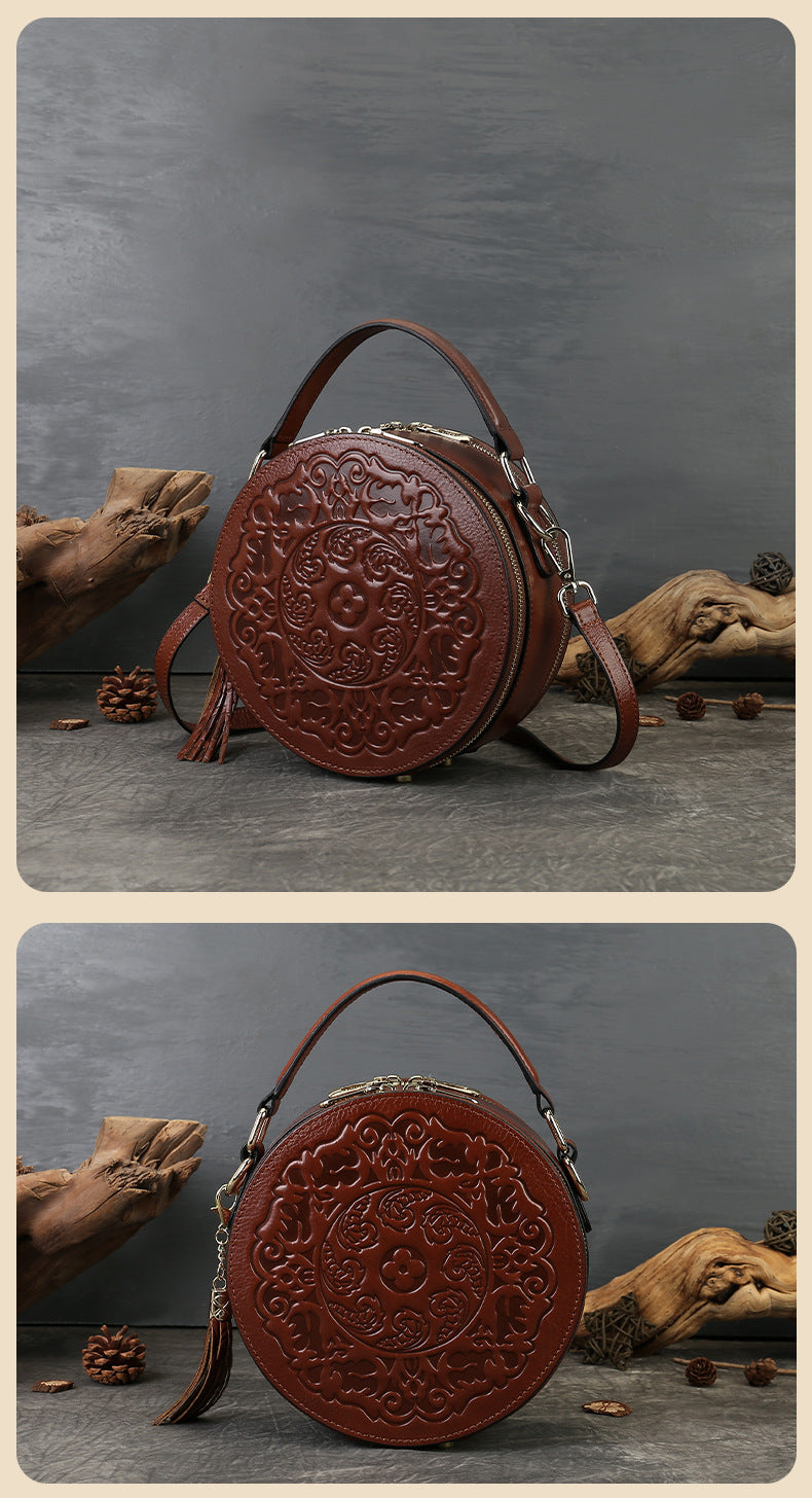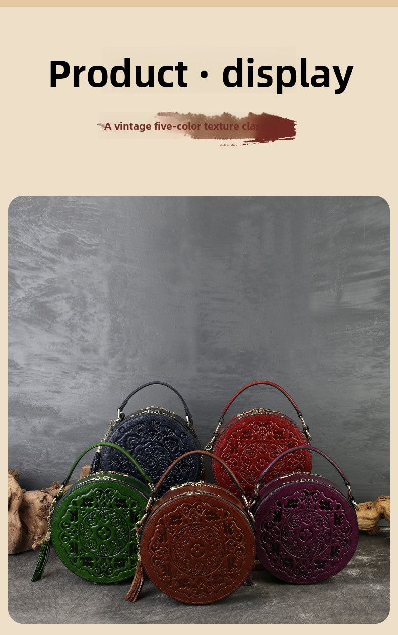 Vintage Embossed Small Round Bag Fortune Transfer Handbag Festive Women's Bag Genuine Leather High-end Ladies Crossbody Shoulder Bag