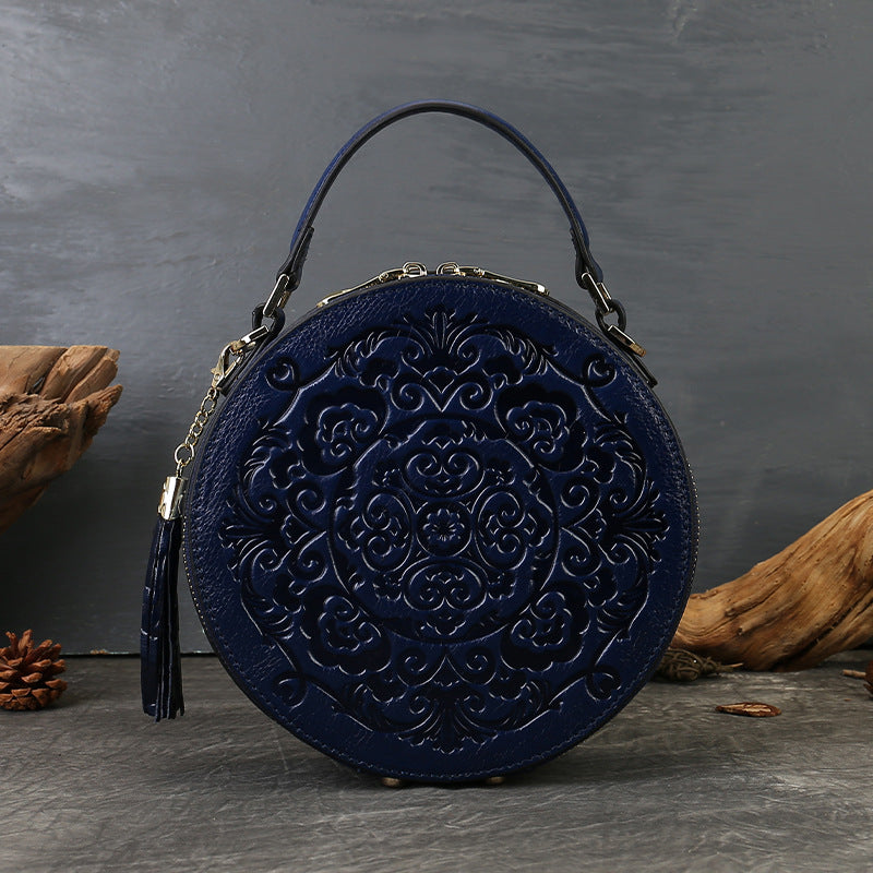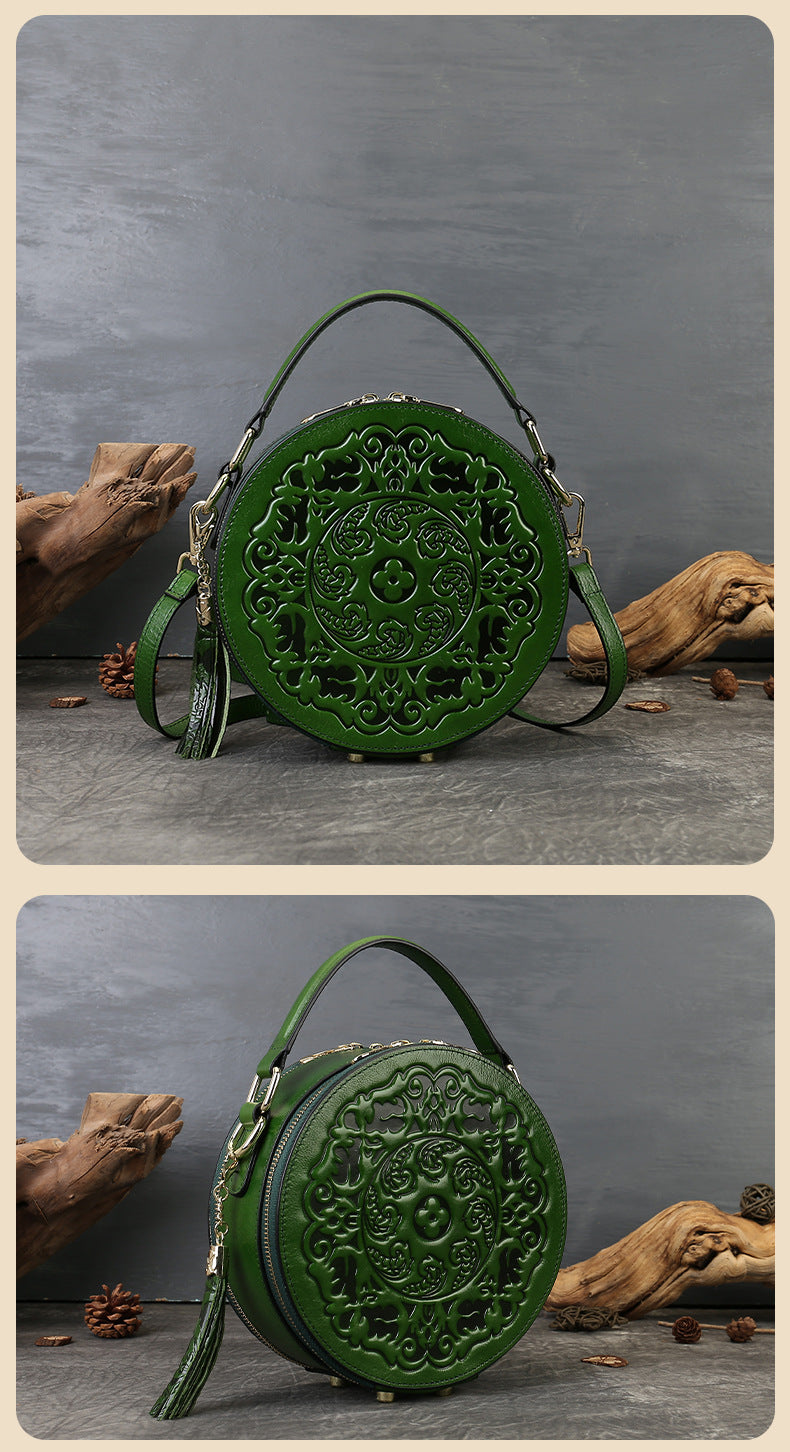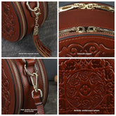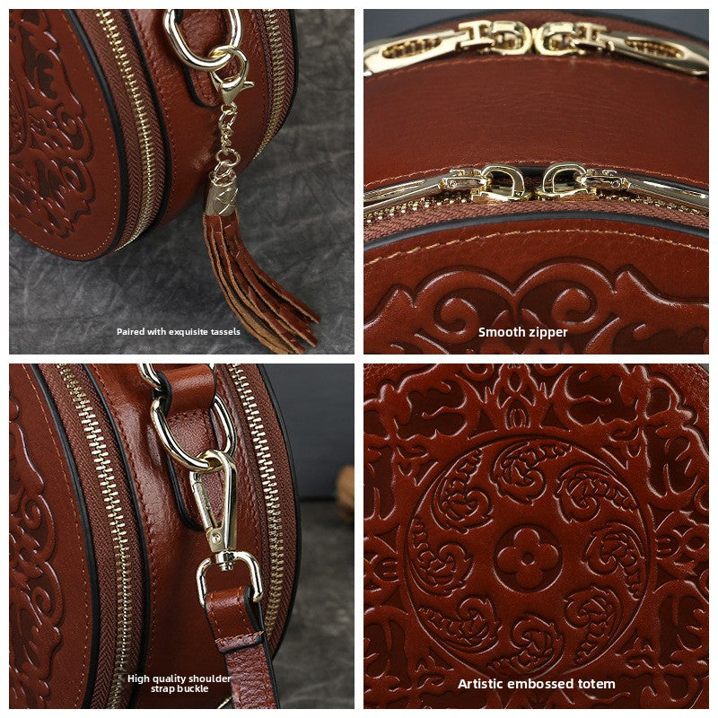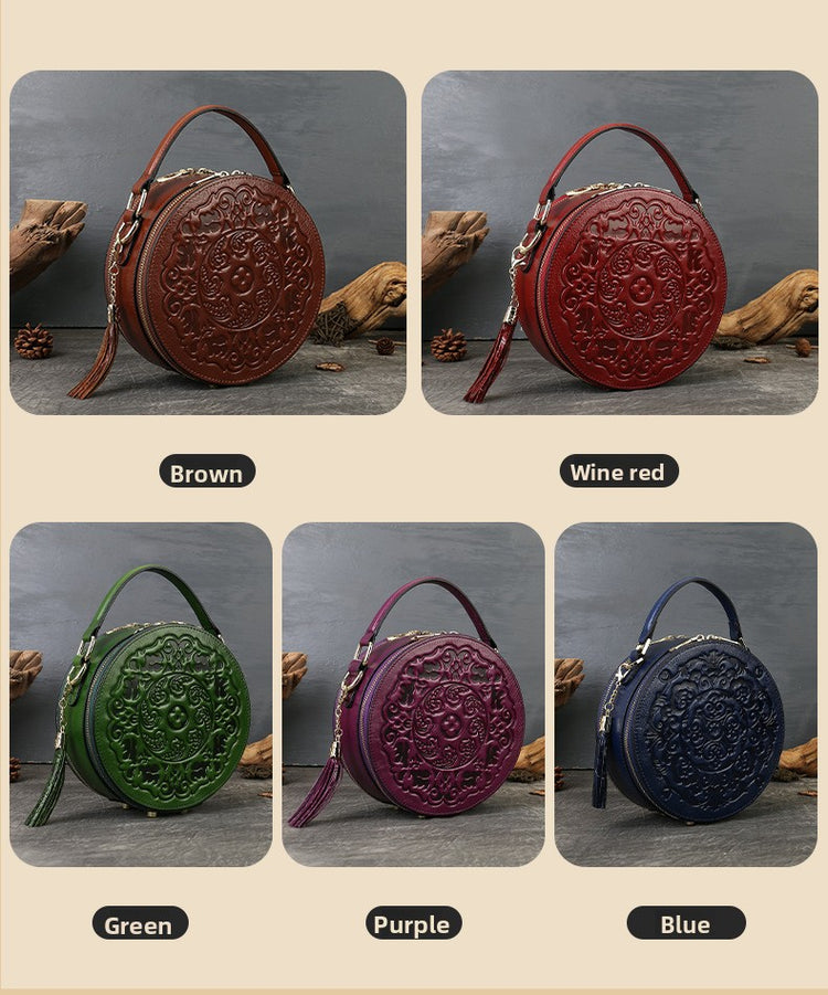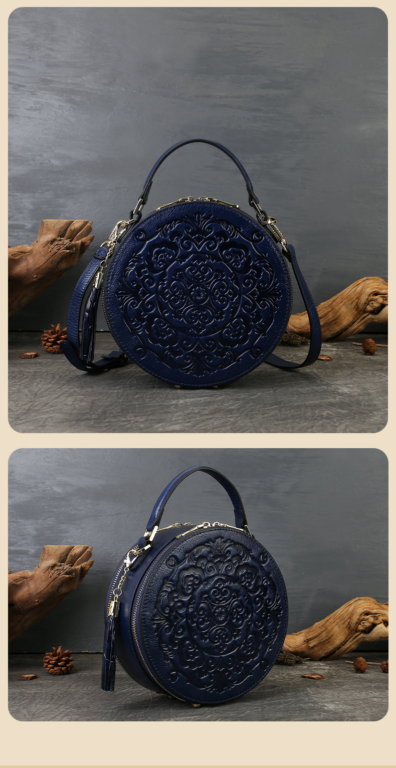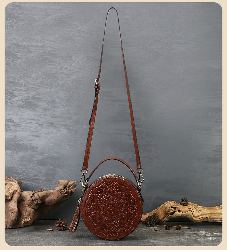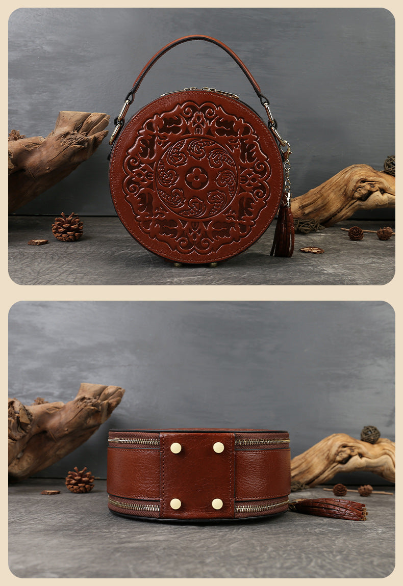 Vintage Embossed Small Round Bag Fortune Transfer Handbag Festive Women's Bag Genuine Leather High-end Ladies Crossbody Shoulder Bag