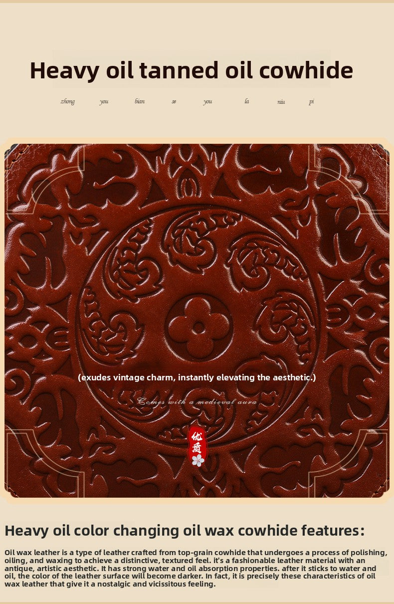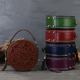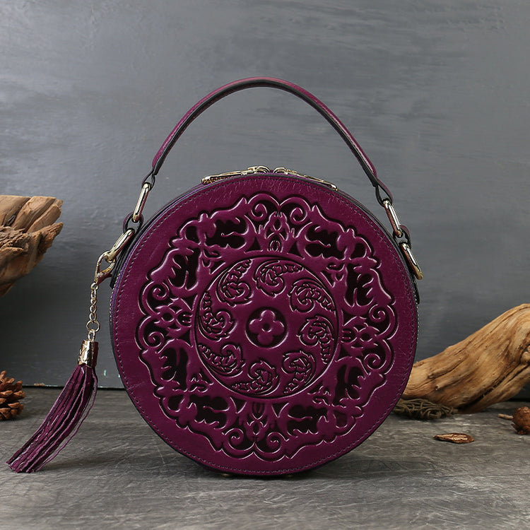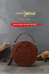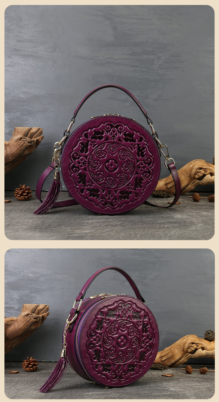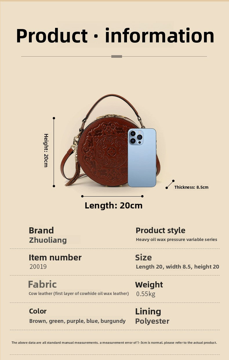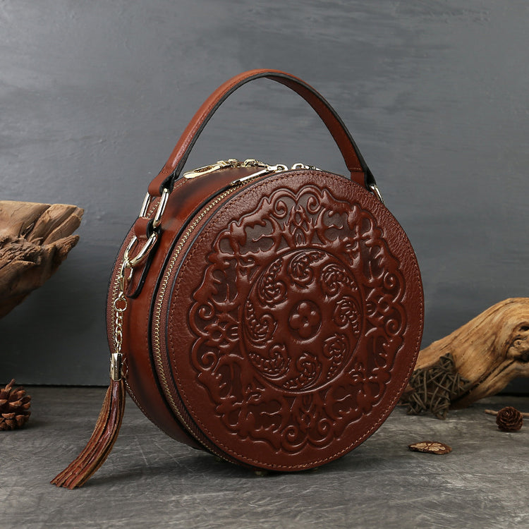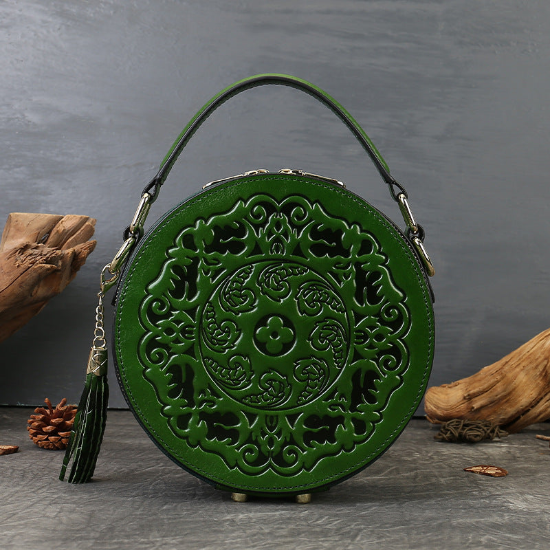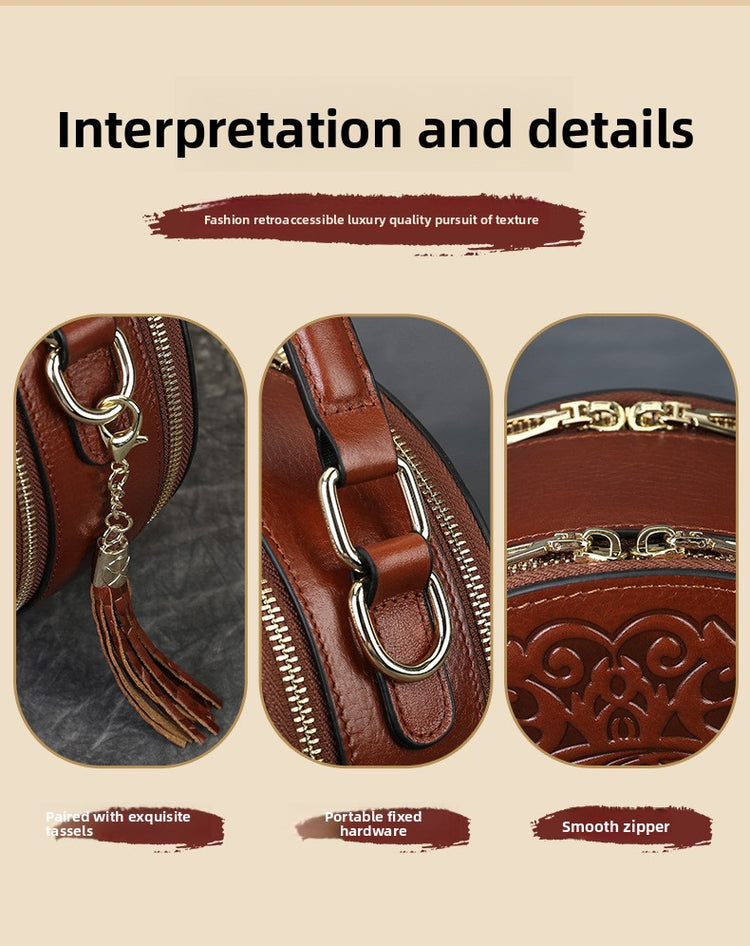 Vintage Embossed Small Round Bag Fortune Transfer Handbag Festive Women's Bag Genuine Leather High-end Ladies Crossbody Shoulder Bag