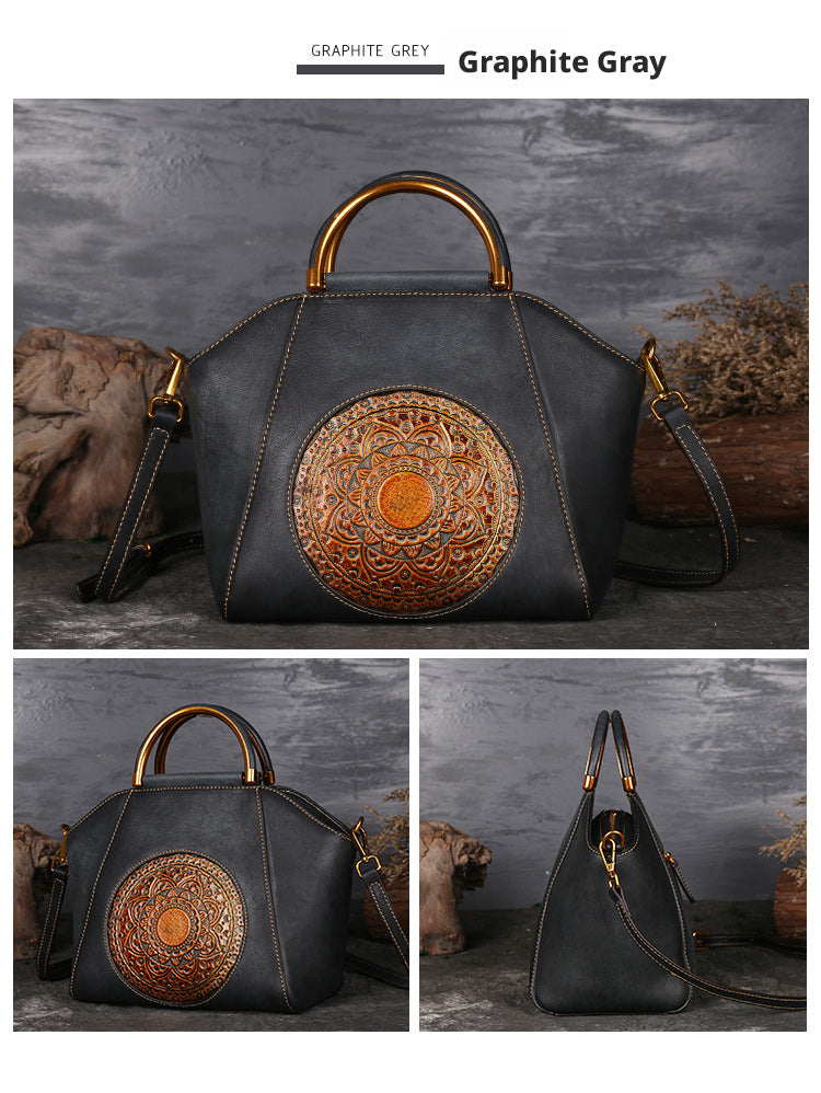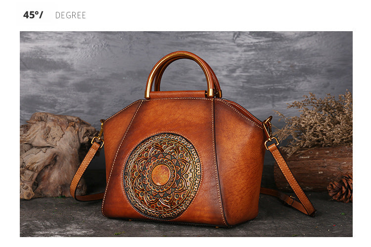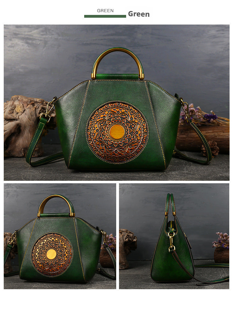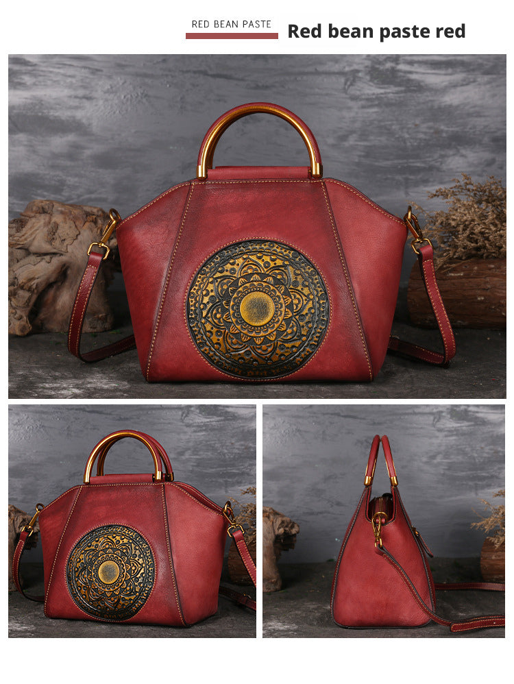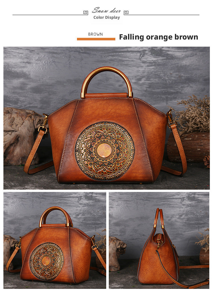 Vintage Full-Grain Leather Handbag for Women – Embossed Totem Top-Handle & Crossbody Bag