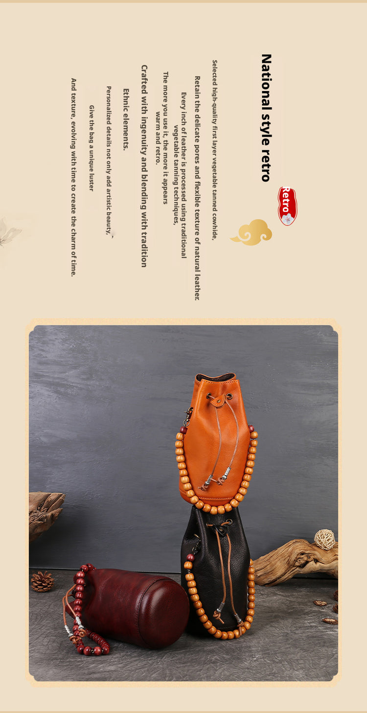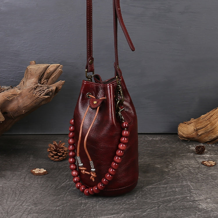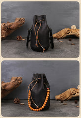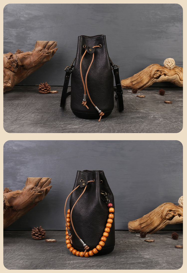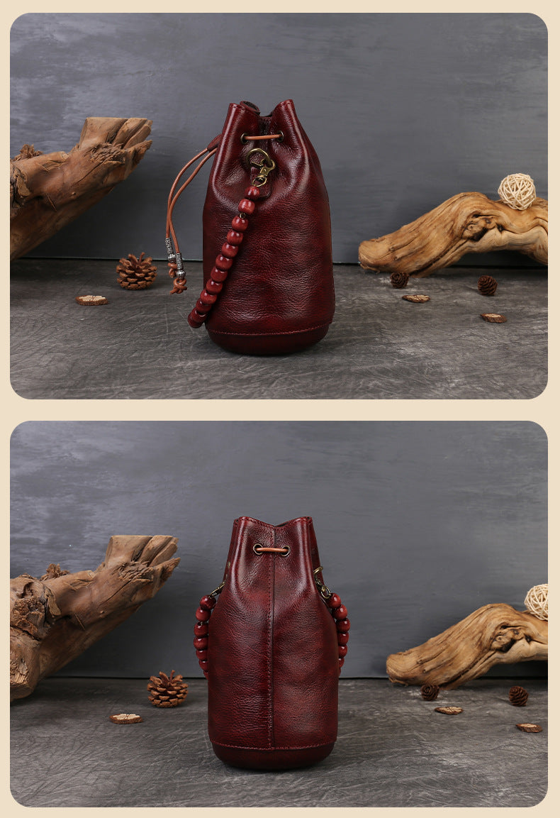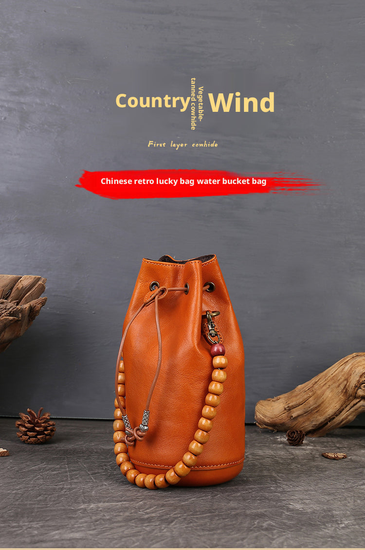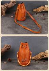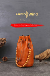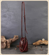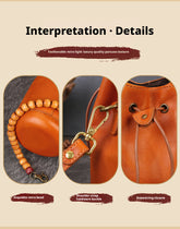 Handmade Vegetable Tanned Cowhide Leather Women's Crossbody Bag Retro Fortune Bag Drawstring Bucket Bag Mini Tote Handbag