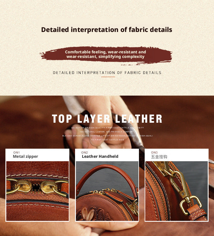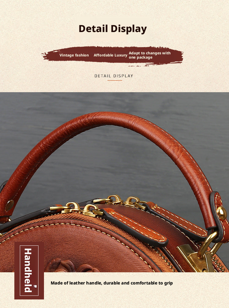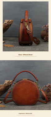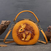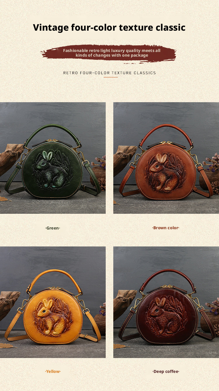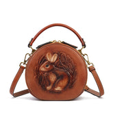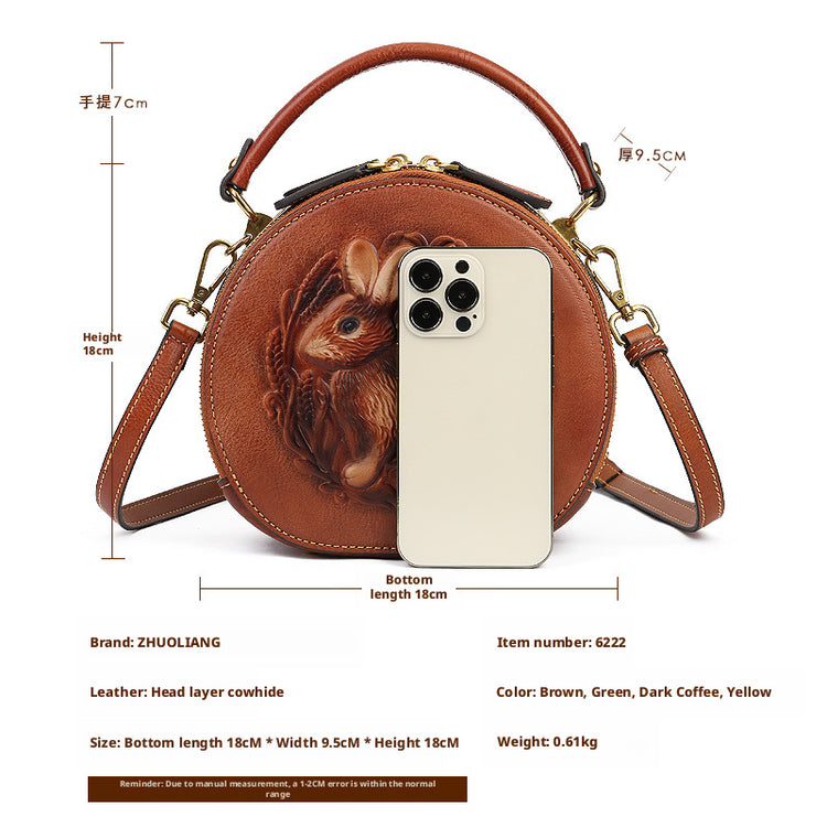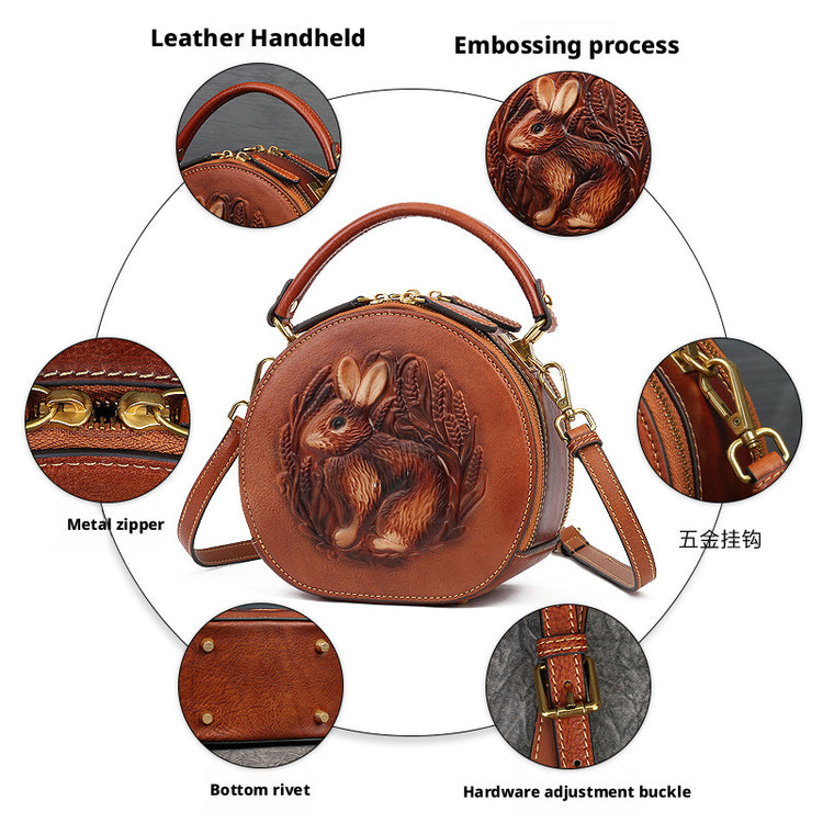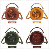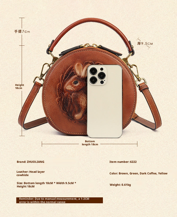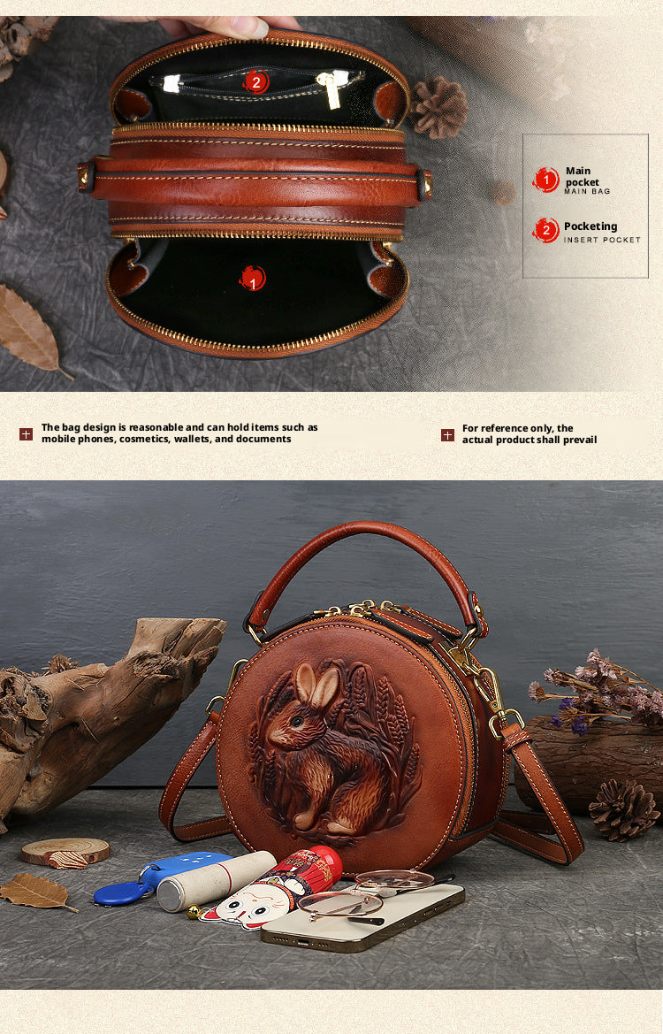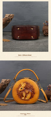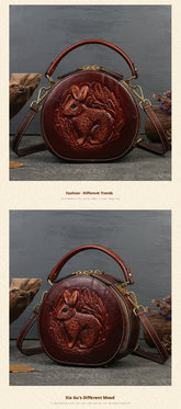 Inspired by traditional craftsmanship, this handcrafted genuine leather bag blends vintage elegance with a modern artistic soul.The round silhouette is adorned with an intricate embossed animal motif, symbolizing nature, freedom, and individuality —making each piece truly distinctive.