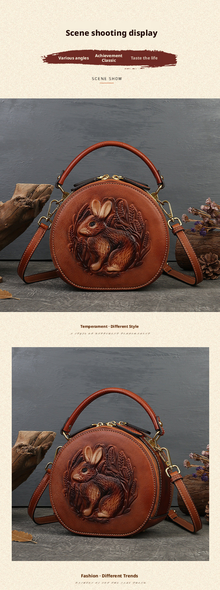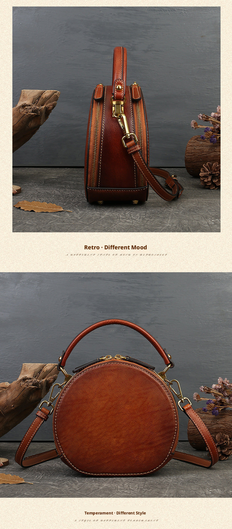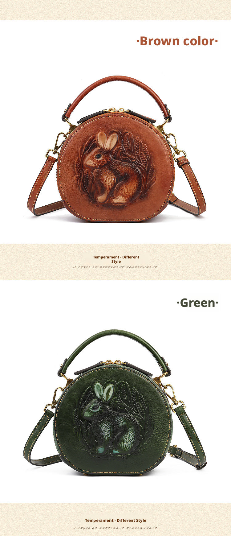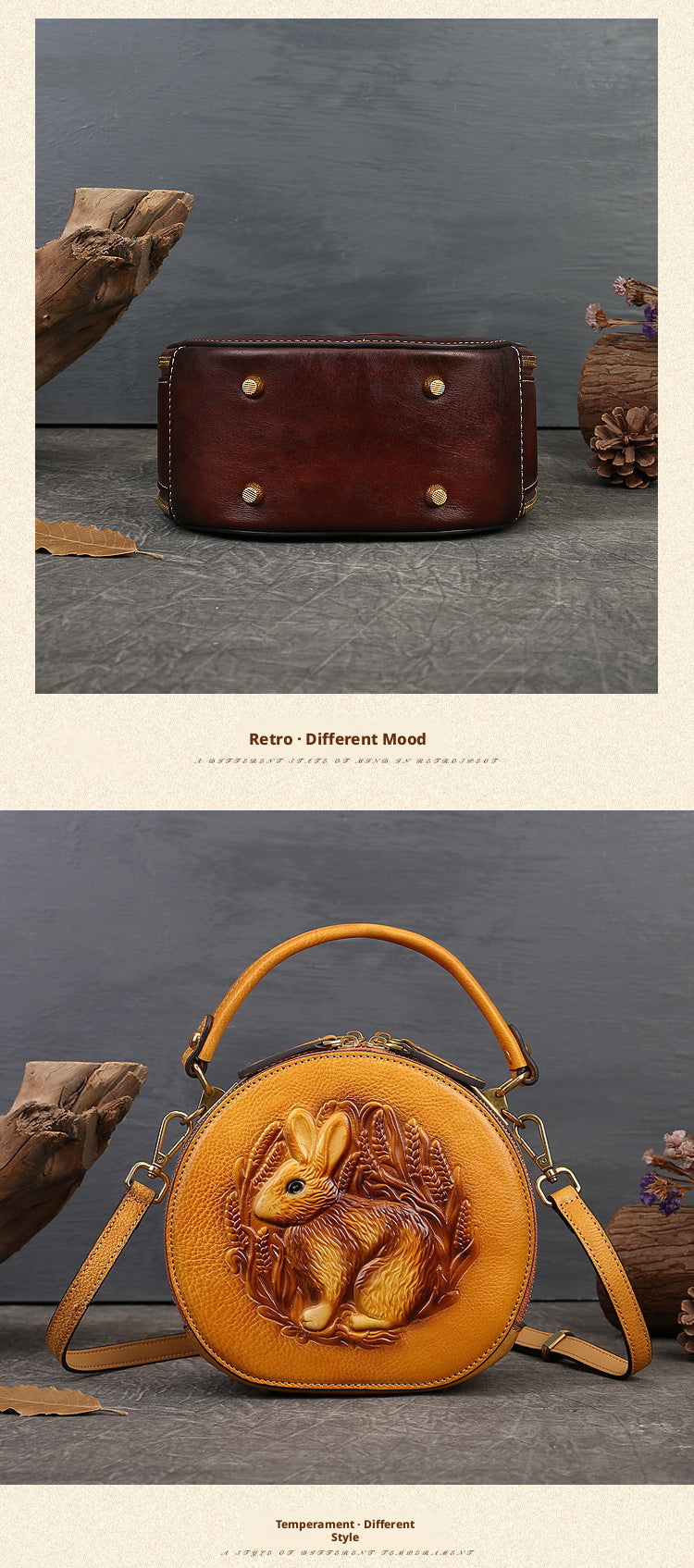 Inspired by traditional craftsmanship, this handcrafted genuine leather bag blends vintage elegance with a modern artistic soul.The round silhouette is adorned with an intricate embossed animal motif, symbolizing nature, freedom, and individuality —making each piece truly distinctive.