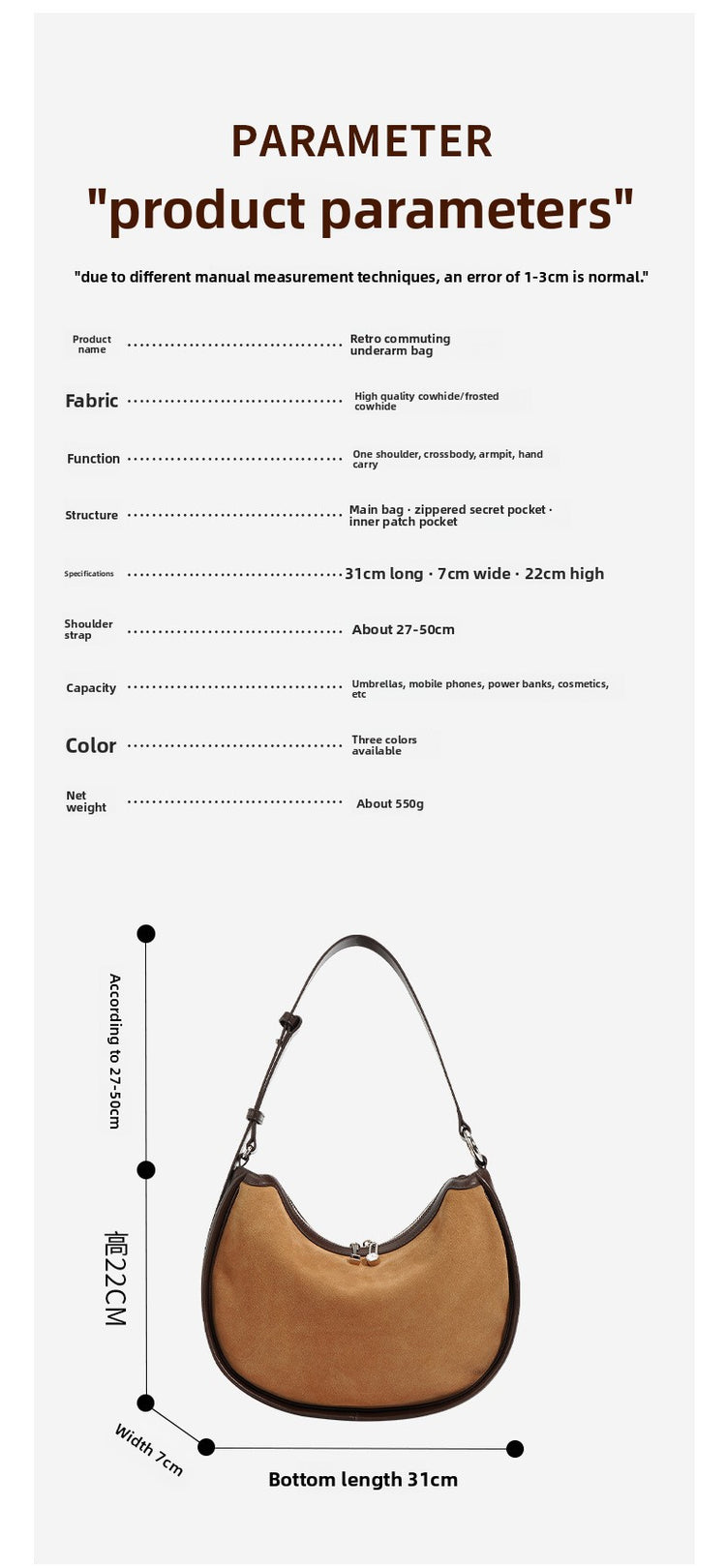 New Genuine Leather Crossbody Shoulder Underarm Bag Niche High-End Vintage Commuter Matte Cowhide Handheld Crescent Bag
